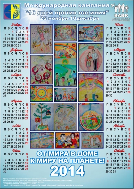 Центр Социально-Экономического развития САБР совместно с общественным движением молодежи «Камолот» провели 11 ежегодный конкурс рисунков и плакатов в рамках международной кампании «16 дней против насилия» на тему: «От мира в доме к миру на Планете!». Учащиеся из 25 школ, изостудий, колледжа искусств, детского дома приняли участие в конкурсе, прислав около 150 рисунков и плакатов.